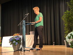Es ist schön zu sehen, wie geschmackvoll ihr alle heute Nachmittag gekleidet seid“, stellte Frau Scharf direkt zu Beginn ihrer Rede fest und bemerkte, dass sie einige der anwesenden Schüler*innen nur in Jogginghose, ungeschminkt oder mit nassen Haaren kenne, besonders wenn der Unterricht in der 0. Stunde lag.