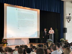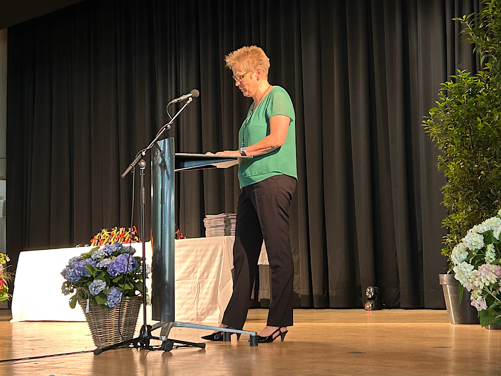 Nach der Begrüßung durch die Moderatorinnen Jana Schwark und Lena Racz sprach Schulleiterin Cirsten Scharf den Schüler*innen zunächst ein besonderes Kompliment dafür aus, wie gut alle an diesem Nachmittag aussahen.