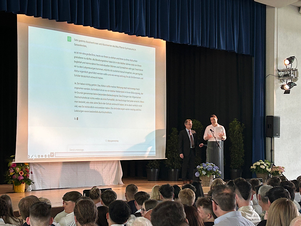 Anschließend entließen die beiden Stufenleiter Martin Westerhaus und Lukas Czarnuch ihre Schützlinge in die Freiheit und ließen sich dabei von der Künstlichen Intelligenz unterstützen, getreu dem Motto: Weisst du nicht mehr weiter wie, frage einfach ChatGPT. Dabei verwiesen sie auf eine spezielle Truppe und ganz besondere Persönlichkeiten, die es garantiert auch ohne ChatGPT im Leben zu etwas bringen werden.