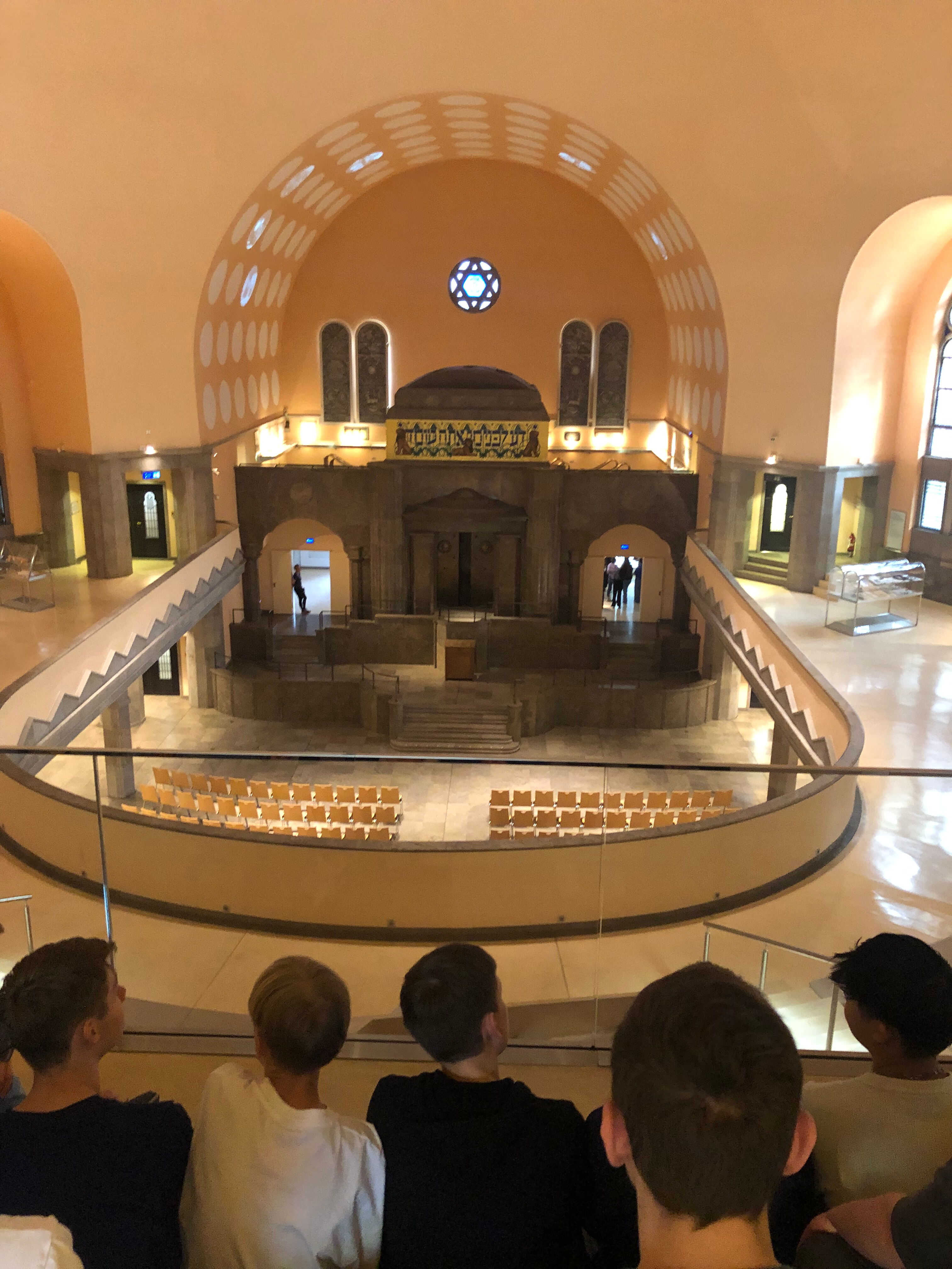 Am Freitag, dem 14. Juni, besuchten wir zusammen mit Frau Brormann und Frau Brühl-Schreiner die alte Synagoge in Essen. Bei dem Besuch konnten wir viel über die jüdische Kultur und Religion lernen, sowie über die Geschichte des Gebäudes an sich. Zum Beispiel wurde uns erzählt, wie das Innere der Synagoge am 09. November 1938 komplett abbrannte und, dass der Eingang für eine Straßenerweiterung verkleinert wurde.