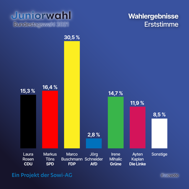 Insgesamt haben 177 von 217 wahlberechtigten Schülerinnen und Schüler gewählt! Dies entspricht einer Wahlbeteiligung von 81,57 Prozent.