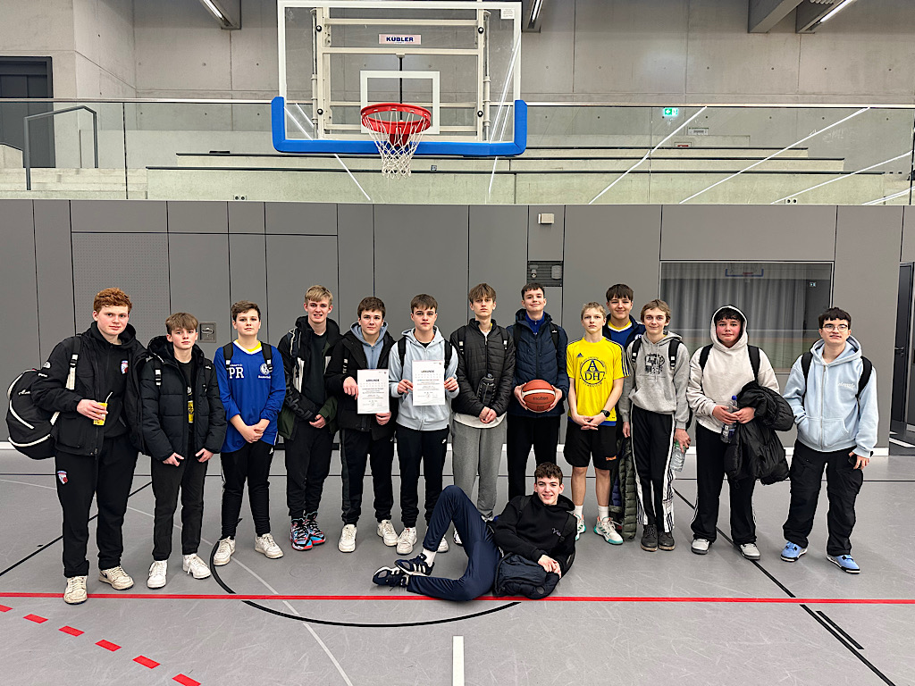 Da das Waltroper Gymnasium ebenfalls schon von Münster besiegt worden war, traf unsere Schule beim letzten Spiel um die sprichwörtliche goldene Ananas auf Waltrop. Die beiden Mannschaften lieferten sich ein enges Duell, bei dem sich keine Mannschaft richtig absetzen konnte. Bis zum letzten Spielzug war kaum mehr Spannung sowie Drama möglich. Besonders in der Schlussphase wurden wir leider etwas vom Pech verfolgt. Bei Gleichstand ging es in die letzte Spielminute. Wenige Sekunden vor Schluss hatten die Waltroper bei dem Kampf um den Ball das Glück auf ihrer Seite und die Schiedsrichter entschieden Ballbesitz für Waltrop. Diese verwandelten einen leichten Korbleger, so dass unseren Jungs eine letzte Möglichkeit blieb, um entweder eine Verlängerung zu erzwingen oder aber per Dreipunktewurf den Sieg einzufahren. Dank starker Defense fanden die MPGler keinen einfachen Anschluss, so dass der letzte Wurf nicht das gewünschte Ziel fand und Waltrop etwas glücklich, aber unterm Strich verdient Vizemeister wurde. Insgesamt war es ein toller und unglaublich gut geplanter Tag, ganz im Zeichen des sportlichen Miteinanders. Ich bedanke mich bei der tollen Mannschaft unserer Schule und gratuliere unseren Jungs zu einem tollen dritten Platz beim Bezirksfinale. Danke an Paul Ganß, Maksim Popovic, Niklas Gerhardt, Eymen Özdemir, Lennart Sanders und Erik Wichmann, die mit ganz viel Herz und tollen Einsatz unsere Schule auf ganz tolle Weise repräsentierten. Ebenfalls ein großes Dankeschön geht an die Jungs vom AvD, die lautstark für uns „mitbrüllten“ und für gute Laune sorgten, und an Peter Holle, der uns die problemlose An- und Abreise per Reisebus ermöglichte.
