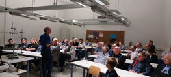 Herr Dr. Timmerhaus gestaltete eine interessante Stunde zum Thema "wirkende Kräfte bei Dreh- und Kreisbewegungen" unter Einsatz von digitalen Messtechniken, die die Anwesenden beeindruckte, teilweise herausforderte, aber um die Kenntnis bereicherte, dass lediglich die Salatblätter den Kräften in der Salatschleuder standhalten können. Nach ihrem Schulbesuch ließen die Ehemaligen traditionsgemäß den Abend beim Ehemaligen-Treffen im Michaelshaus ausklingen.