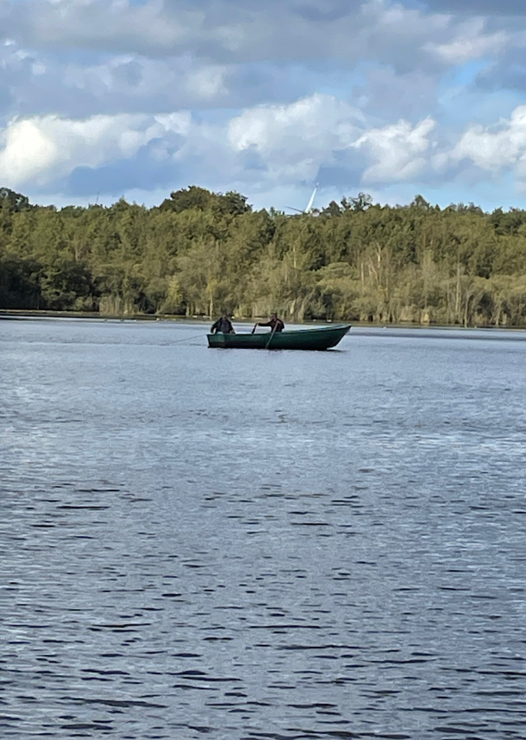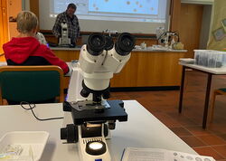 Den zweiten Tag im Naturschutzgebiet verbrachten wir mit der Kontrolle von Fledermauskästen, bei der wir tatsächlich fünf Zwergfledermäuse entdecken konnten, und dem Fällen von invasiven Baumarten wie der amerikanischen Traubenkirsche. Dabei besuchte uns zudem ein Lehrer dreier Teilnehmender, der uns bei unserer Aufgabe half. Wir errichteten Fledermaus-Detektoren in der Hoffnung, einige Aufnahmen zu bekommen. Anschließend sammelten Herr Trapmann und der dazu gekommene Lehrer Planktonproben aus dem Heiligen Meer, die wir, zurück in der Forschungsstätte, mit Mikroskopen untersuchten. Nach dem Abendbrot errichteten wir Fangnetze, die wir die folgenden drei Stunden abwechselnd bewachten. Leider konnten wir in dieser Nacht aber keine Fledermäuse fangen. Als kleinen Trost unternahmen wir mit Herrn Trapmann eine kurze Wanderung zur Sternenbeobachtung.