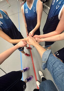 Mit schlechten Vorzeichen ging es für unsere Mädels zum Bezirksfinale nach Münster, da Nika Kretschmer krankheitsbedingt ausgefallen war. Somit reisten unsere Basketballerinnen nur zu fünft und ohne Auswechselspielerinnen zum Finale, um sich dem favorisierten Team aus Recklinghausen zu stellen. Im ersten Viertel sah es noch nach einem spannenden Spiel aus, unsere Mädels erwischten gar den besseren Start und führten in den ersten Minuten, doch die Recklinghäuserinnen kamen immer besser in die Partie. Mit nur wenigen Punkten Rückstand ging es in die Viertelpause. Nach der Pause schaltete Recklinghausen ein paar Gänge höher und bei unserem Team machte sich die fehlende Auswechselungsmöglichkeit bemerkbar; allmählich brachen unsere Mädels konditionell ein und konnten kaum mehr mit dem hohen Tempo Recklinghausens mithalten, so dass zur Halbzeit fast schon alles entschieden war. Nach der Halbzeit versuchte unser Team, sich ein letztes Mal aufzubäumen, die gegnerische Mannschaft war nur leider zu abgebrüht, um sich noch den Sieg nehmen zu lassen. So war das Spiel zum Ende des dritten Viertels bereits entschieden, das letzte Viertel diente dann der kosmetischen Ergebniskorrektur. Am Ende stand Recklinghausen als verdienter Sieger fest, dennoch könnte man kaum stolzer auf unsere sichtlich abgekämpften Mädels sein. Wir danken euch für eine ganz tolle Basketballsaison und freuen uns jetzt schon auf die nächste mit euch! Für unsere Schule spielten: Yara El Sobky, Alina Melzer, Anna Springenberg, Lena Karl und Carla Schenke.