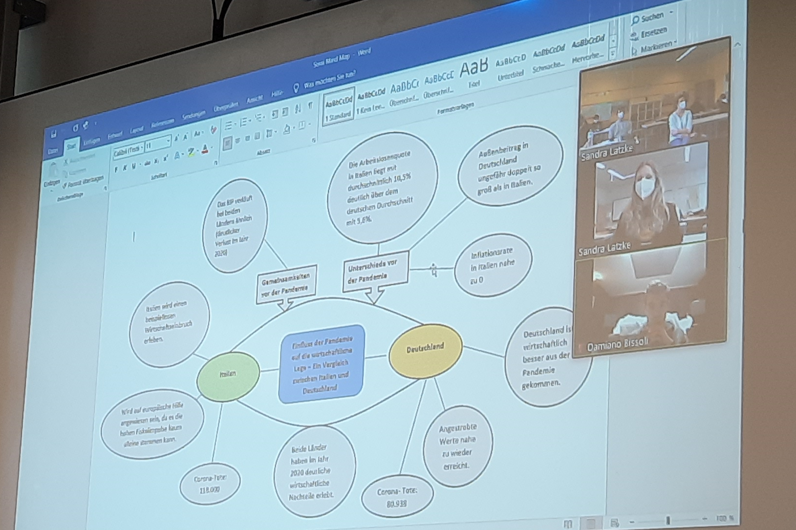 Im Anschluss daran hat der Leistungskurs unter dem Schwerpunkt „Wirtschaft“ und in Anknüpfung an den Unterricht einen digitalen Zeitstrahl zur wirtschaftlichen Zusammenarbeit zwischen Italien und Deutschland sowie eine digitale Concept Map zu den wirtschaftlichen Folgen der Corona-Pandemie in beiden Ländern entwickelt.