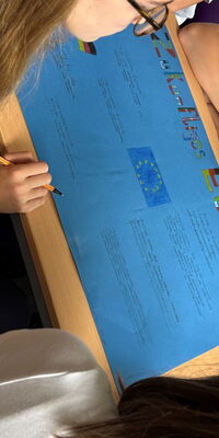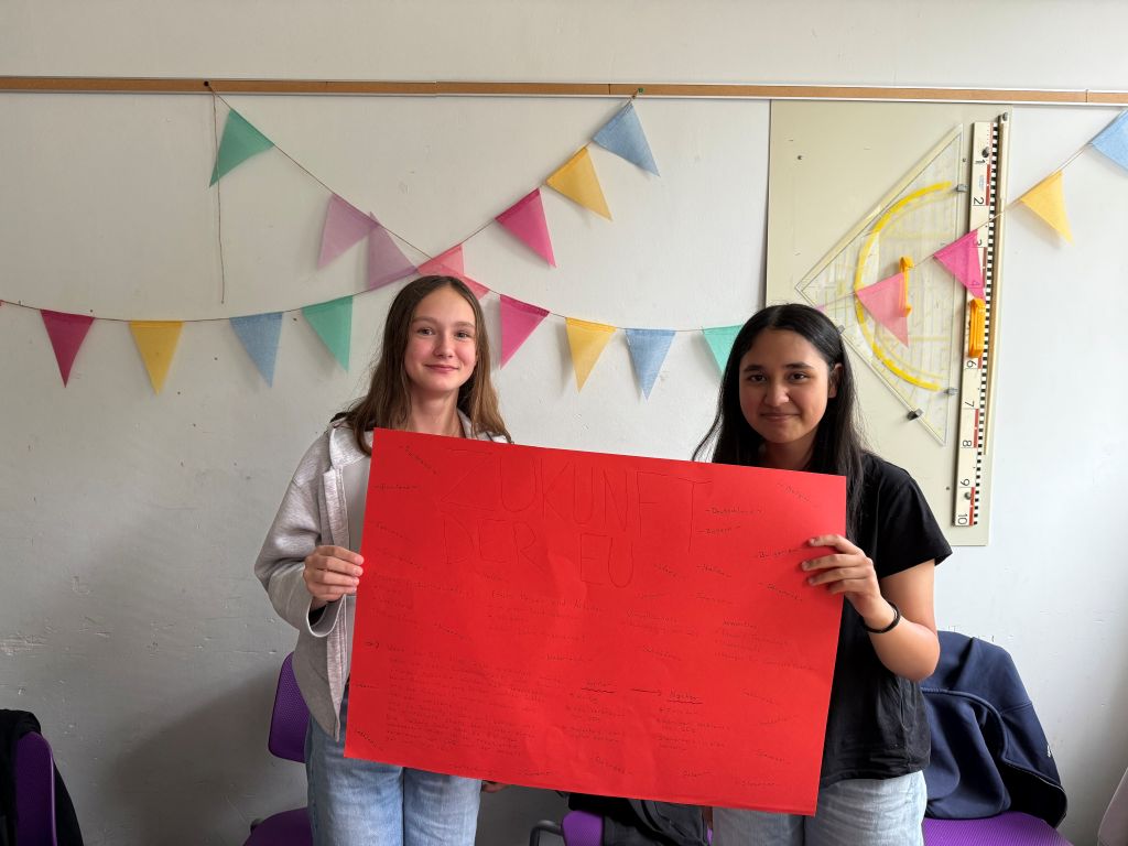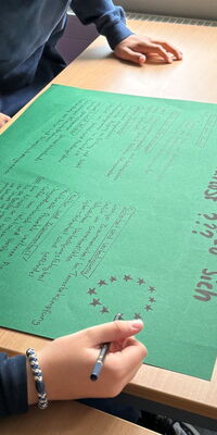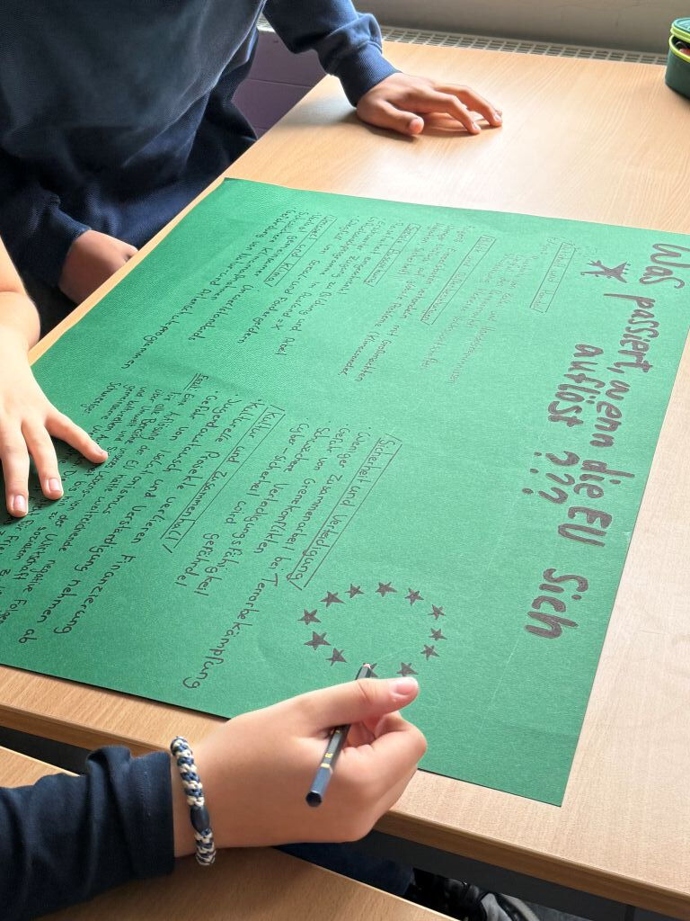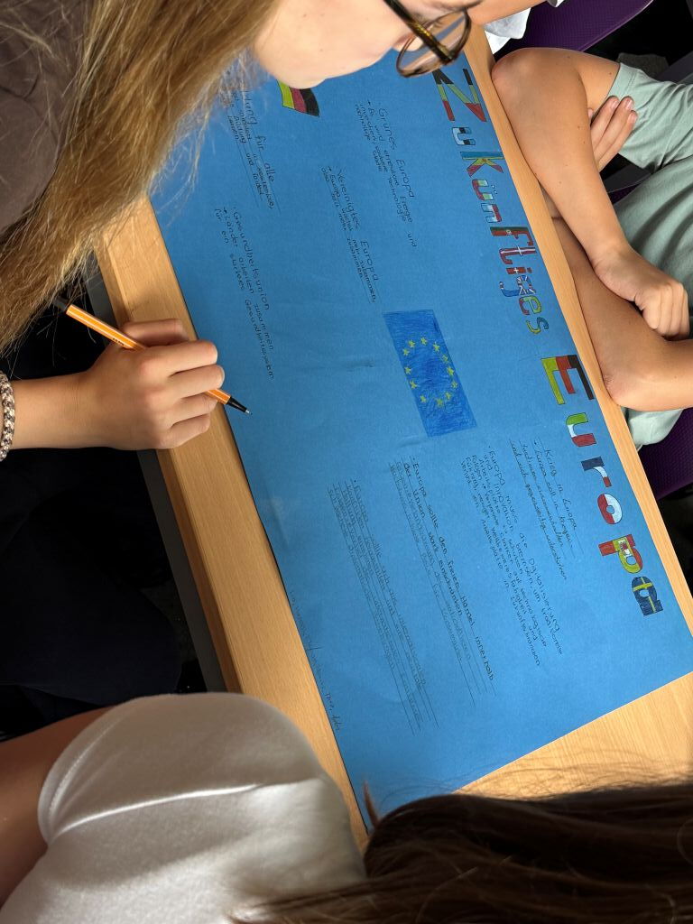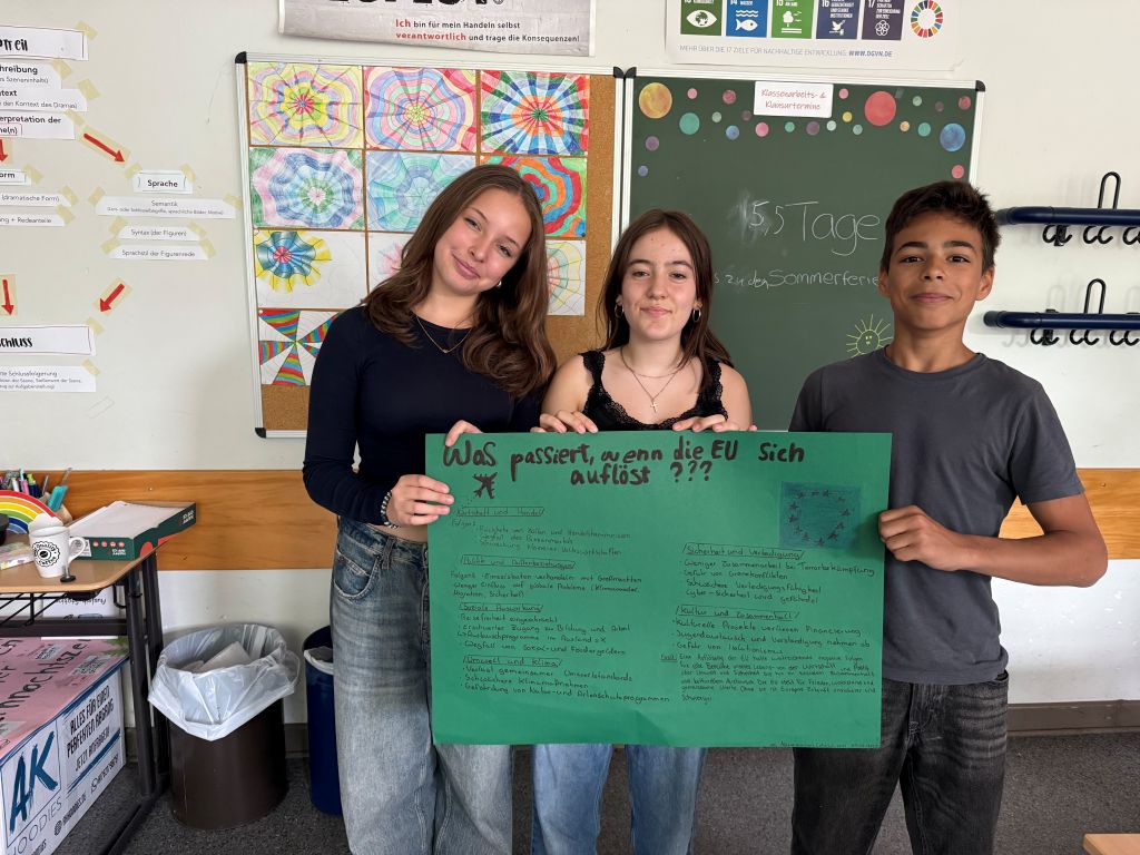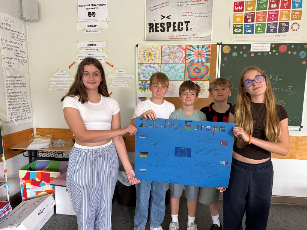 In den Jahrgangsstufen 7 und 8 stand das Thema „Zukunft – EU und Du“ im Mittelpunkt. Mithilfe der Szenario-Technik entwickelten die Schüler:innen eigene Zukunftsvisionen für die Europäische Union. Die Ergebnisse hielten sie in kreativen Plakaten fest, die auch in der Foto-Galerie angeschaut werden können.
