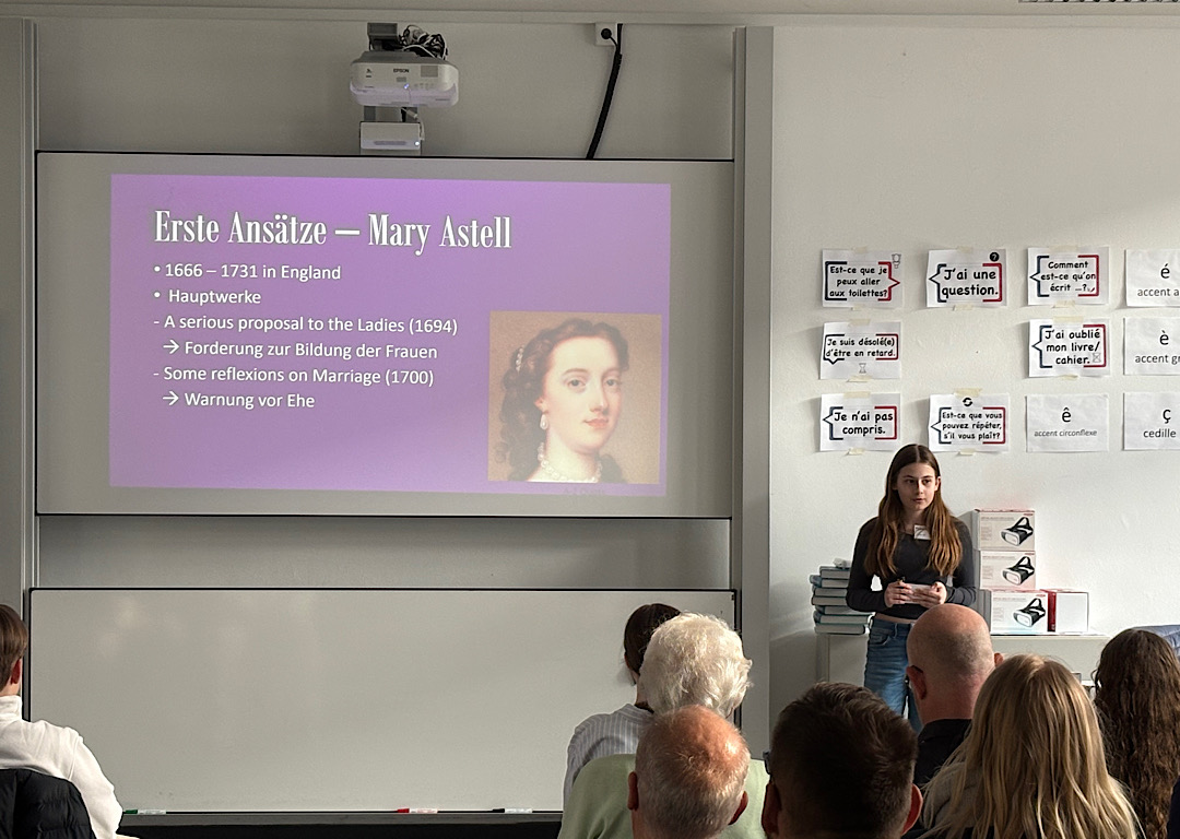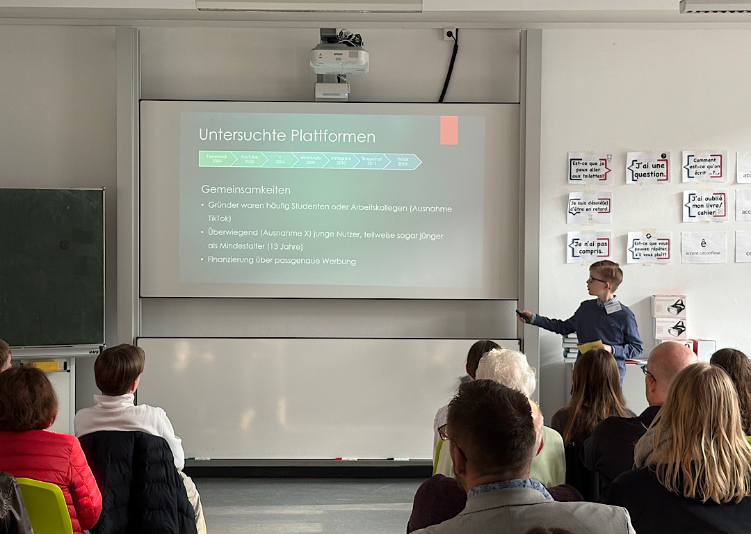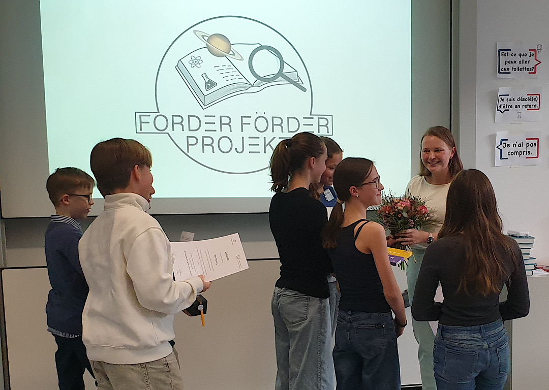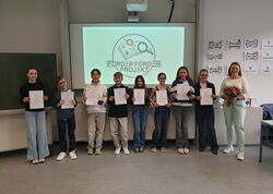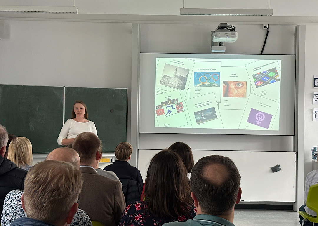 Begeistert lauschte das Publikum den anspruchsvollen Präsentationen über die Themen „Der Kampf um Gerechtigkeit“ (Rebecca Funke 8b), „Social Media - Die beliebtesten Plattformen unter der Lupe“ (Henrik Timmerhaus 7d), „Die Haut - Unser größtes Organ“ (Juna Hoppe 7d), „Leichathletik“ (Mara Hackstein 7b), „Die Olympischen Spiele und ihre Historie“ (Anton Kahlenberg und Theo Hojnisz 7b) und „Die Nachkriegszeit - in Gelsenkirchen und Deutschland“ (Charlotte Berns und Sophia Müller 7c). Leider konnte Elisa Schreiner (8d) ihren Vortrag über Frauenfußball in Deutschland krankheitsbedingt nicht halten. Am Ende der Expertentagung überreichte Frau Stein, Projektleiterin des Forder-Förder-Projekts, den Expertinnen und Experten eine Urkunde, die sie für ihre außerordentlichen Leistungen auszeichnet und ihren Expertenstatus im Themenbereich ihrer Arbeit bescheinigt, als Andenken an die tolle Projektzeit!