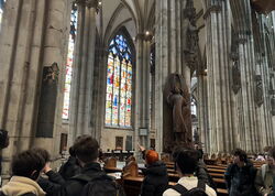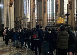 Der erste Höhepunkt der Exkursion war der Besuch des Kölner Doms. Bei einer informativen Führung erfuhren wir viel über die Geschichte und die beeindruckende Architektur des Doms. Besonders faszinierend waren die kunstvollen Details der gotischen Bauweise und der Blick auf die Türme – immerhin zählt der Kölner Dom mit einer Höhe von 157,22 Metern zu den beliebtesten Sehenswürdigkeiten Deutschlands! Ein besonderes Highlight für uns war der Blick auf den goldenen Schrein, der die Gebeine der Heiligen Drei Könige beinhaltet. Wieso? Ganz VIP-mäßig durften wir hinter die Absperrungen treten, die die Reliquie von Besuchern trennt, und das mit Edelsteinen verzierte Gold aus nächster Nähe begutachten.