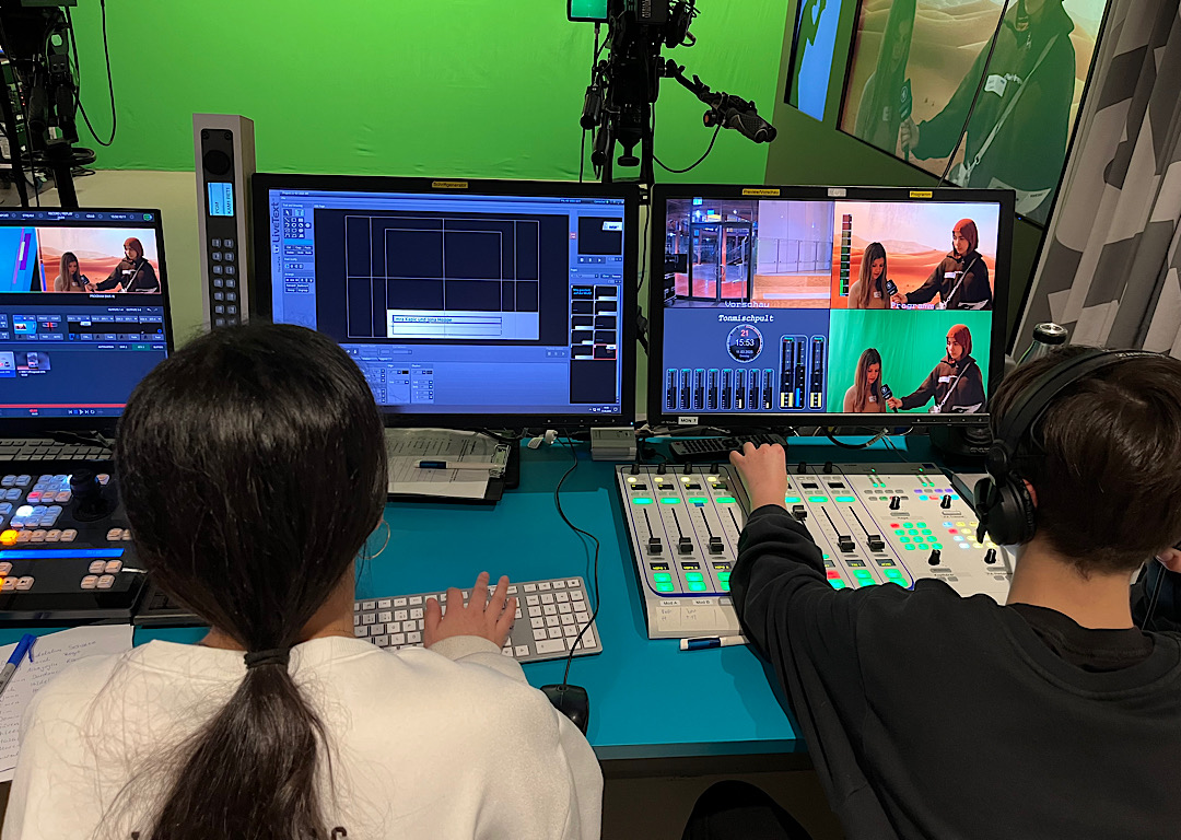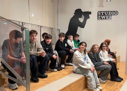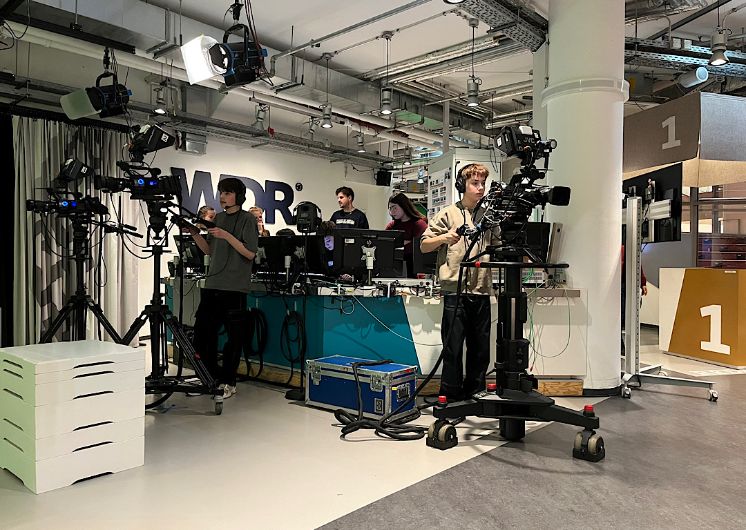 Nachdem wir die Kölner Innenstadt in Kleingruppen auf eigene Faust erkundet hatten, bot sich uns ein Blick hinter die Kulissen in der Medienwerkstatt des WDRs. Dort wurden wir von zwei großen Teams vom WDR in Empfang genommen. Aufgeteilt in zwei Kleingruppen wurden wir in den Workshops Fernsehen und Radio selbst aktiv und durften eine eigene Magazinsendung und eigene Radionachrichten produzieren. Dabei durften TV- und Radiosprecher:innen, Requisiten und die große Crew hinter den Kulissen natürlich nicht fehlen! Wir waren begeistert, unsere eigenen Beiträge aufnehmen zu dürfen und erlebten hautnah, wie Nachrichten im Medienbereich produziert werden. Besonders erfreulich für uns: Die selbst erstellten Nachrichten durften wir mit nach Hause nehmen!