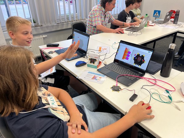 Seit einem Jahr findet regelmäßig montags das Projekt Bits4Teens statt, eine Informatik-AG, in der Schülerinnen und Schüler der 7. Klassen die Möglichkeit haben, in die faszinierende Welt der Technik und Programmierung einzutauchen. Erstes Projekt in der AG war für die Schülerinnen und Schüler die Programmierung des Calliope, eines vielseitigen Mikrocontrollers mit schon eingebauten Sensoren, die viele kreative Projekte möglich machen.