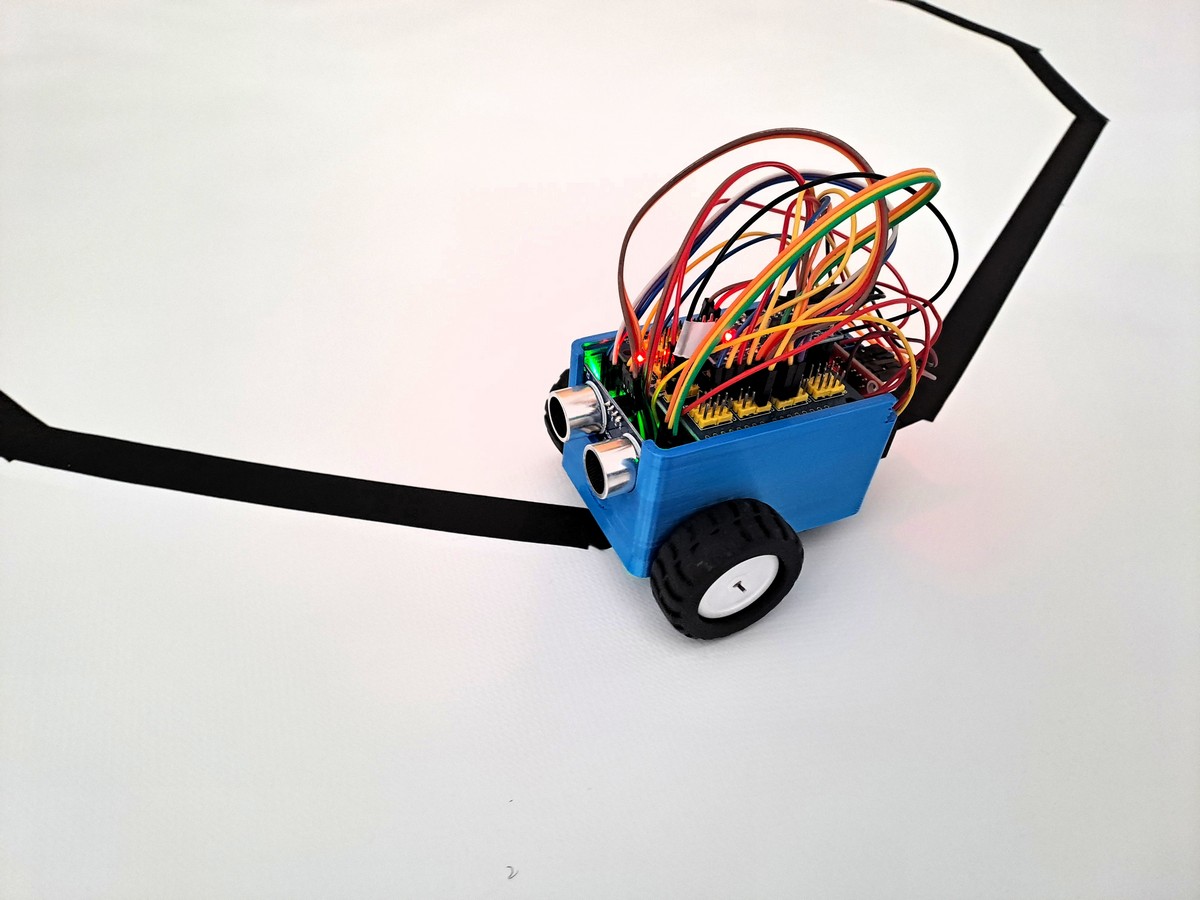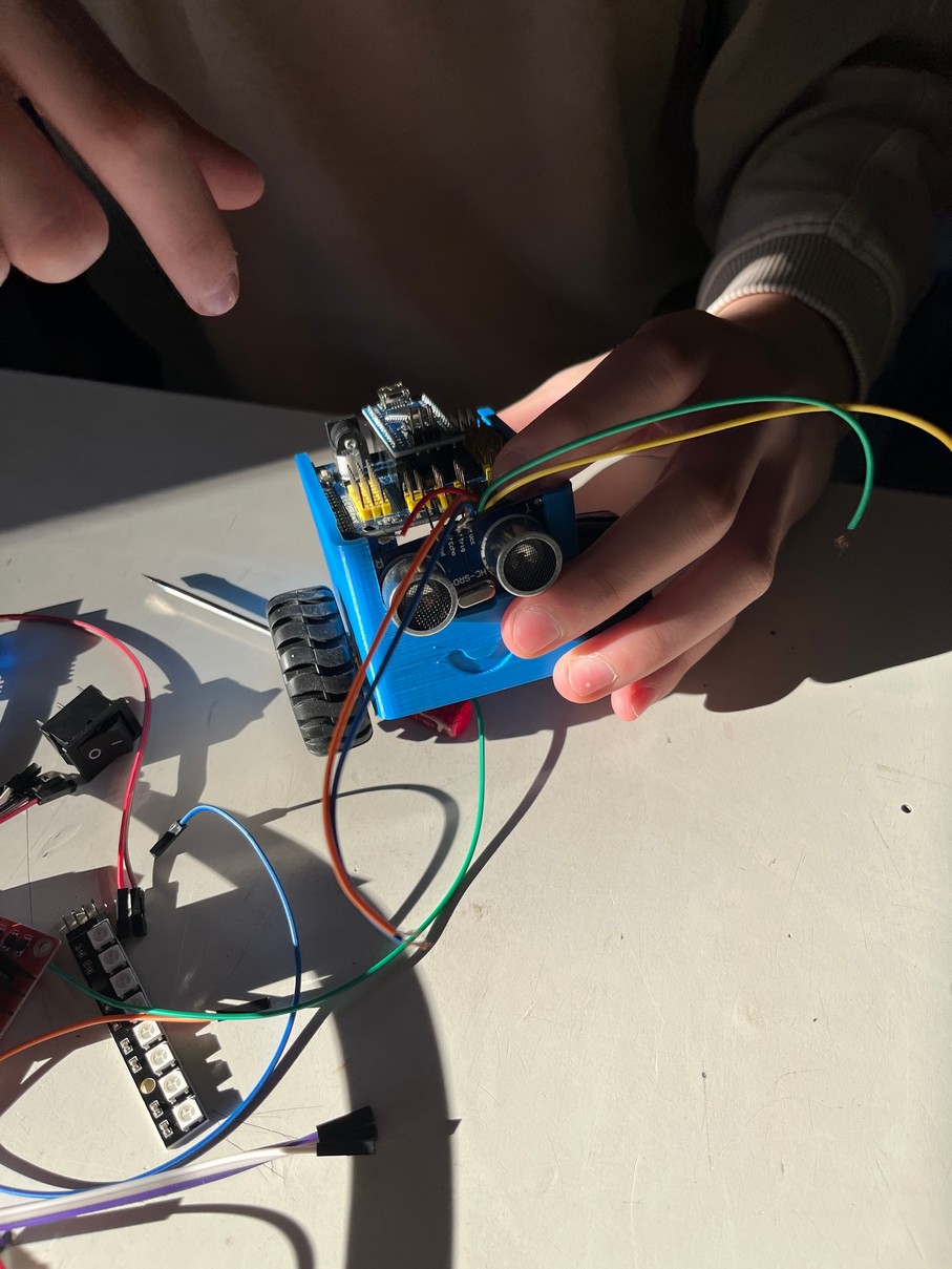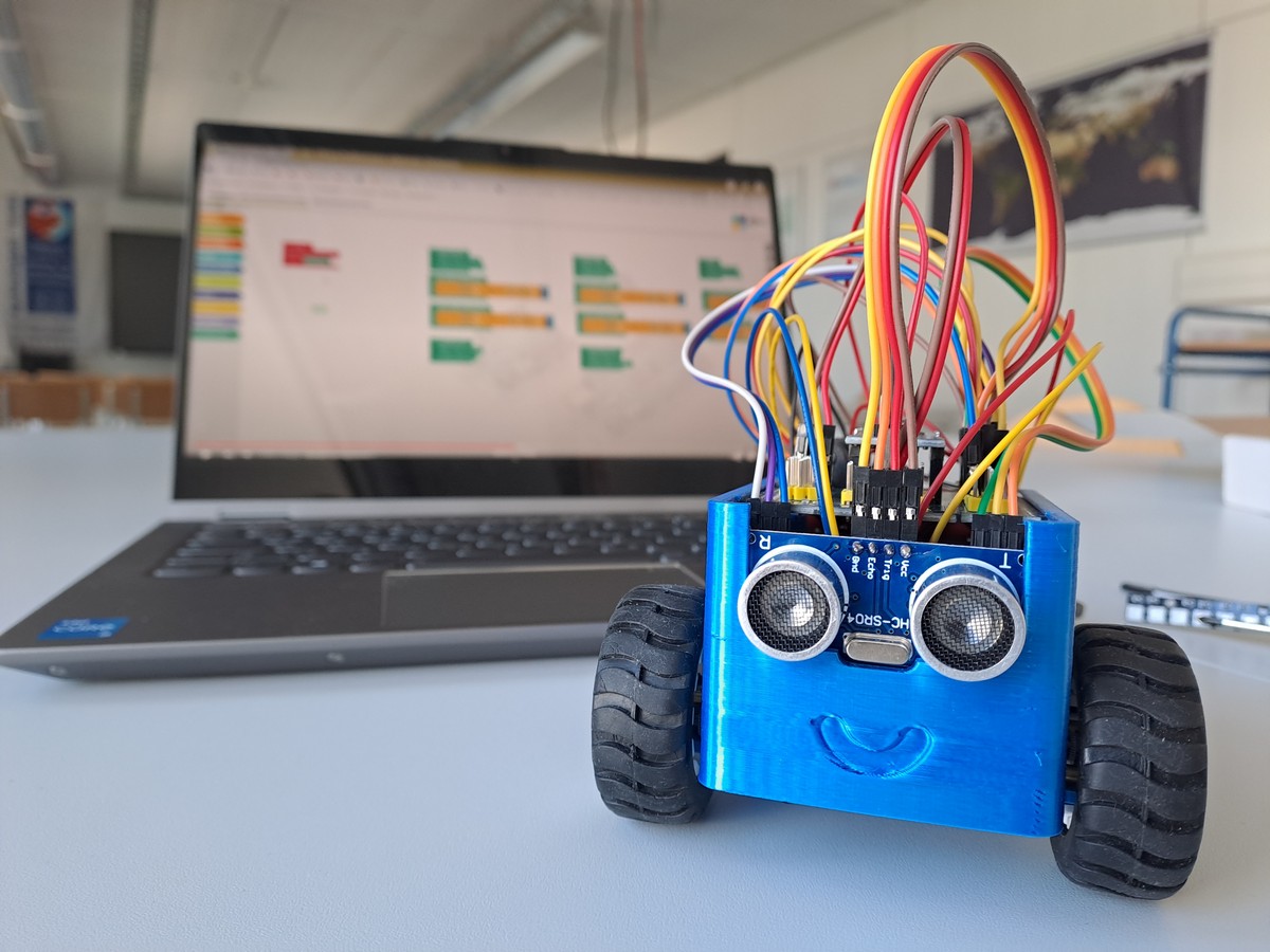 Im zweiten Halbjahr haben alle Teilnehmenden der AG einen Roboter, den Düvelbot, selbst gebaut und programmiert. Der Bausatz des Roboters sah anfangs sehr kompliziert aus. Aber Stück für Stück entstanden bei allen Schülerinnen und Schülern Düvelbots, die individuell programmiert werden und Aufgaben erfüllen können, zum Beispiel vor Hindernissen ausweichen oder einer Linie folgen können. Lernvideos erklären die Montageschritte und Programmierung, sodass jeder Bot in seinem eigenen Tempo entsteht.