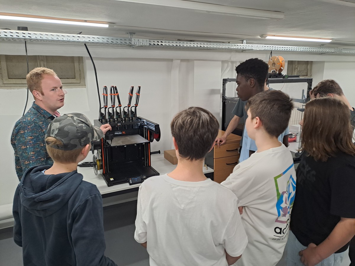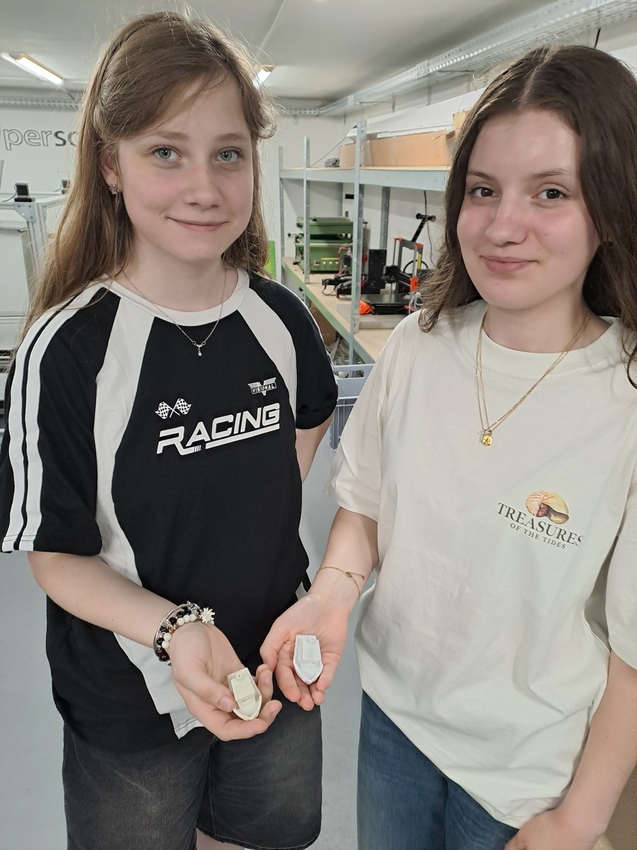 Dabei wurde ganz nebenbei viel Wissen zur blockbasierten Programmierung mit der visuellen Programmiersprache NEPO auf der offenen Plattform Open Roberta des Fraunhofer-Instituts vermittelt. Im 3D-Druck-Modul erlernten die Schülerinnen und Schüler, wie dreidimensionale Modelle nach eigenen Entwürfen erstellt werden. Sie nutzten dazu Programme wie TinkerCAD und Fusion 360. So konnte jede(r) Teilnehmende die eigenen Ideen und Designs konstruieren und danach direkt vor Ort ausdrucken. Nebenbei wurde klar, dass man auch ein paar Details über die Funktionsweise von 3D-Druckern lernen und ausprobieren muss, um für den Druck geschickt zu konstruieren!