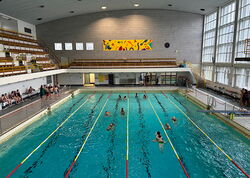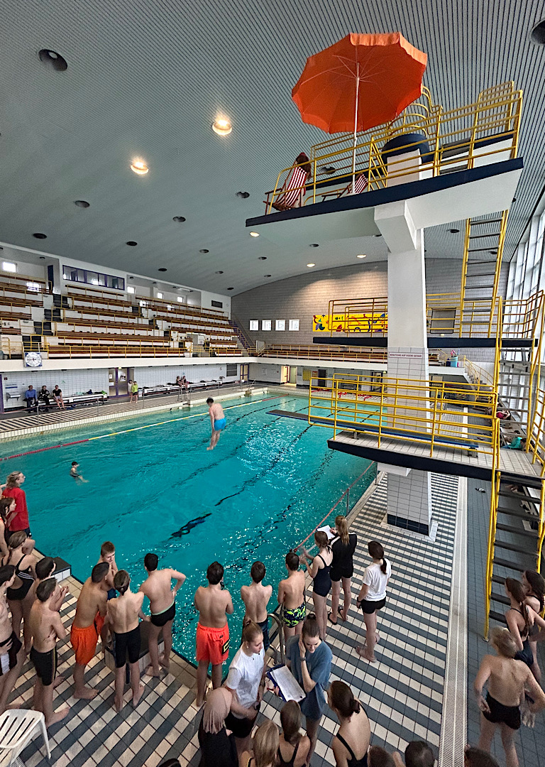 Das Schwimmfest fand wie jedes Jahr im Hallenbad Buer statt. Die teilnehmenden 7. Klassen trafen zur jeweiligen Uhrzeit für die Bronze-, Silber- und Goldprüfungen ein. Die Goldgruppe kam als Erstes und begann mir dem Ausdauerschwimmen. Danach durften sie eine Pause machen. Nach der Pause wurden sie im Kopfsprung und dem Streckentauchen über 10 Meter geprüft. Im weiteren Verlauf kamen die anderen beiden Gruppen und machten ihre entsprechenden Prüfungen, nachdem die Sporthelfer:innen sich kurz mit ihnen abgesprochen hatten.