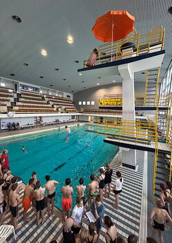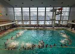 Nach einer ebenfalls kurzen Besprechung begann Gold nun auch mit dem Tieftauchen, jedoch mussten sie die Übung 3 x wiederholen. Die Silbergruppe hatte währenddessen Pause und spielte Wasserball im Nachbarbecken. Die Bronzegruppe hatte den Kopfsprung beendet und mit dem Tieftauchen weitergemacht. Weitere Übungen waren das Springen vom Startblock und das Schwimmen in Rückenlage mit unterschiedlichen Schwierigkeitsgraden. Im Anschluss daran fingen alle drei Gruppen mit den Sprüngen vom Sprungturm an, wobei Sprünge aus 3 und 5 Metern und unterschiedliche Sprünge vom Einmeterbrett gezeigt werden mussten.