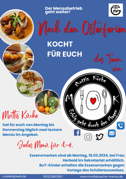 wie bereits angekündigt wird ab der Woche nach den Osterferien der neue Caterer Muttis Küche in der Mensa für den Mittagstisch sorgen. Der Essensplan für die 15. Kalenderwoche kann in der PDF am Ende der News bereits eingesehen werden.