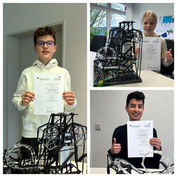Mit insgesamt zwei Beiträgen haben Schüler*innen des MPG am diesjährigen Schülerwettbewerb Junior.ING teilgenommen. Unter dem Motto „Achterbahn - drunter und drüber“ wussten die Modelle von Lotte Böcker (7c), Alexander Sallai (8c) und Emre Cakmakkaya (10d) die Jury zu überzeugen. Das Modell von Emre konnte sich dabei sogar für das Landesfinale am 30.04.24 qualifizieren. Insgesamt wurden in den beiden Altersklassen 81 Beiträge eingereicht, von denen die besten 7 Modelle aller Altersklassen eine Auszeichnung erhielten. Auch die Modelle von Lotte und Alexander bekamen eine Urkunde für die erfolgreiche Teilnahme. Hervorragend unterstützt und begleitet wurden unsere Schüler*innen von Herrn und Frau Kaesewinkel (Eltern einer Schülerin aus dem 5. Jahrgang).