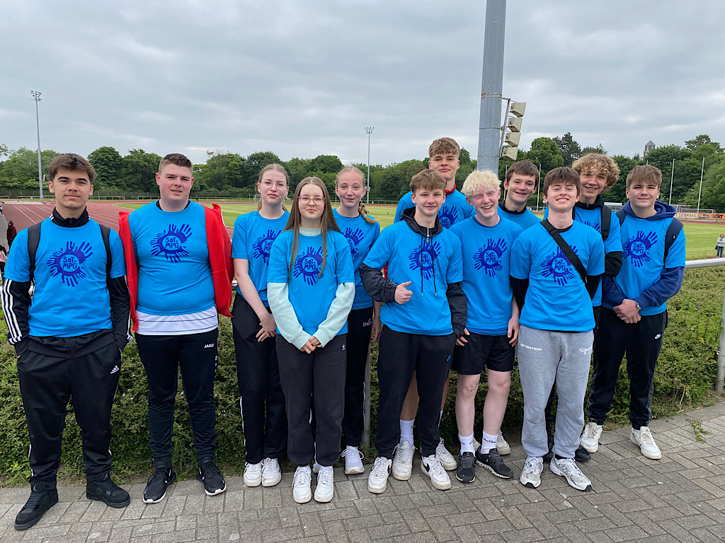 Am vergangenen Freitag machten sich unsere angehenden Sporthelfer*innen der Jahrgangsstufe 9 auf den Weg nach Bottrop. Dort fand an der Förderschule "Schule am Tetraeder" das Sportfest statt. Im Rahmen der Kooperation des MPG mit der Schule am Tetraeder unterstützten die Sporthelfer*innen die Lehrer*innen vor Ort bei der Durchführung von leichtathletischen Disziplinen und kleinen Spielen. Für unsere Schüler*innen bietet dieser Termin schon seit einigen Jahren die Möglichkeit, sportliche Aktivitäten von Kindern mit dem Förderbedarf "Geistige Entwicklung" zu begleiten und mögliche Berührungsängste abzubauen.