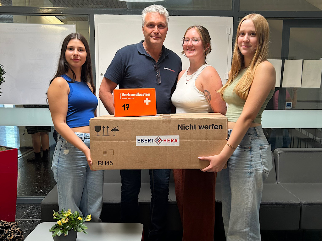 Kurz vor den Sommerferien erhielt unsere Schule eine großzügige Spende von der Firma EBERT HERA GmbH. Herr Holger Zank, der Sicherheitsbeauftragte der Firma des Standortes Recklinghausen, übergab dem Schulsanitätsdienst des Max-Planck-Gymnasiums überzähliges Verbandsmaterial zur weiteren Verwendung. Mit diesem Material können die Schülerinnen und Schüler des Sanitätsdienstes weiter üben und im Notfall eine Erstversorgung vornehmen. Herr Lübberdink als Ausbilder und Leiter des Schulsanitätsdienstes bedankte sich bei Herrn Zank herzlich für die Unterstützung dieser Spendenaktion, die mittlerweile schon das dritte Mal durchgeführt werden konnte.