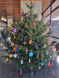 Pünktlich zum ersten Advent hat die SV in der Pausenhalle einen Tannenbaum liebevoll geschmückt - mittlerweile eine schöne Tradition am MPG.