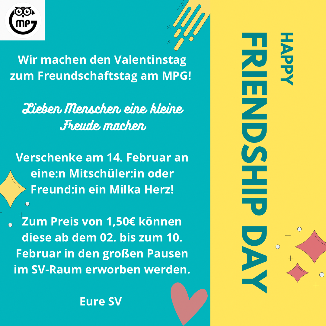 Den diesjährigen Valentinstag nimmt die SV am MPG zum Anlass, um einen „Friendship Day“ zu feiern. „Lieben Menschen eine Freude machen“ – unter diesem Motto können im Zeitraum vom 02. Februar bis zum 10. Februar in den großen Pausen Milka-Herzen für 1,50€ am SV-Raum (R033) erworben werden, um diese an Schüler:innen und Freund:innen am Valentinstag zu verschenken. Wie schon bei der SV-Nikolausaktion werden die kleinen Aufmerksamkeiten auch hier in Eurem Namen am Valentinstag in der Schule verteilt.