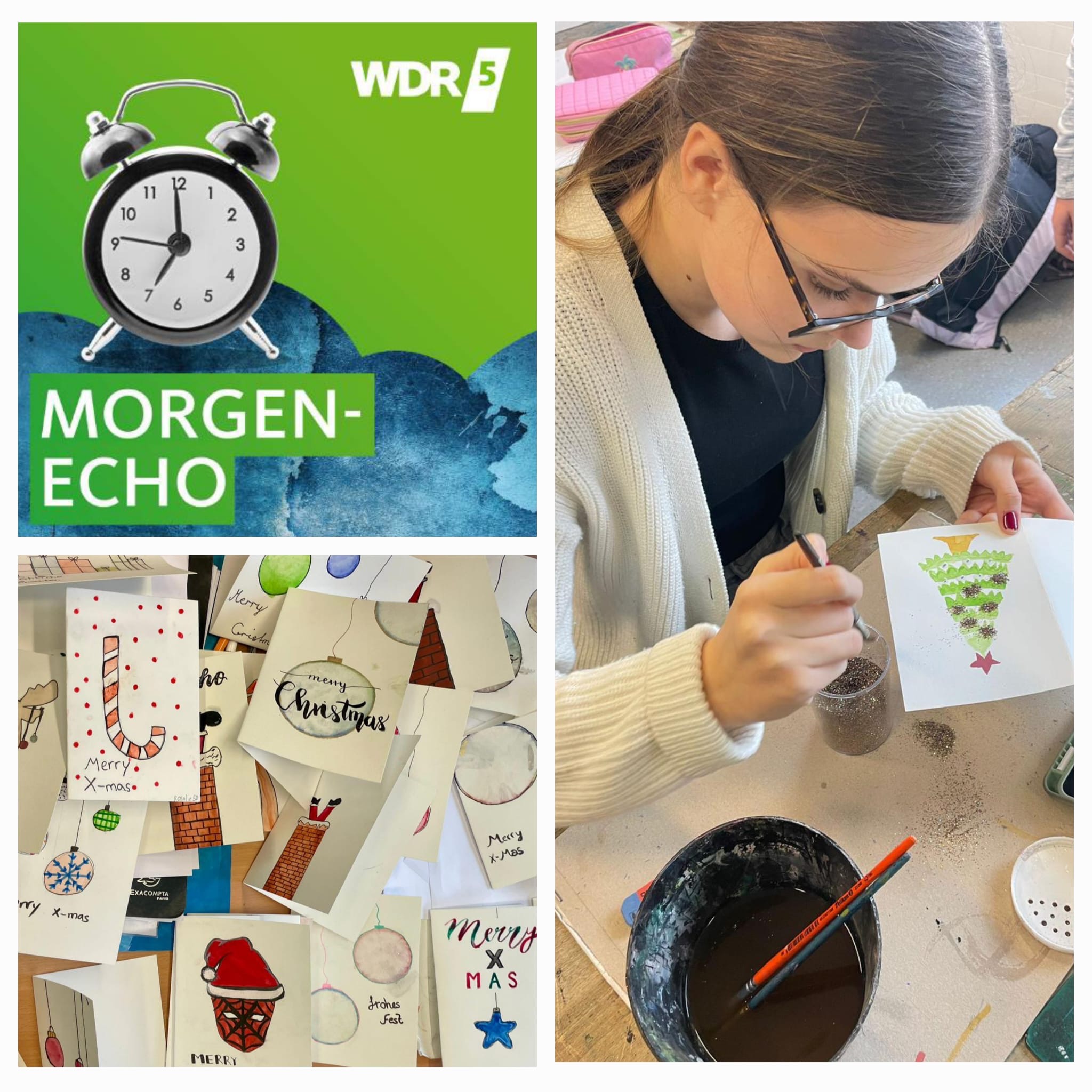 Über diese Aktion wurde heute Morgen im Radio in der Sendung "Morgen-Echo" auf WDR 5 berichtet. Die Aufzeichnung dieses Beitrags erfolgte am vergangenen Freitag in der Schule, inklusive einer Chorprobe der Young Singers und Interviews mit einigen Schülerinnen und Frau Platzköster, die über die Idee des Verkaufs für den guten Zweck und die Herstellung der Karten erzählten. Den vollständigen Beitrag von Simon Schomäcker kann man als Podcast über den folgenden Link hören.