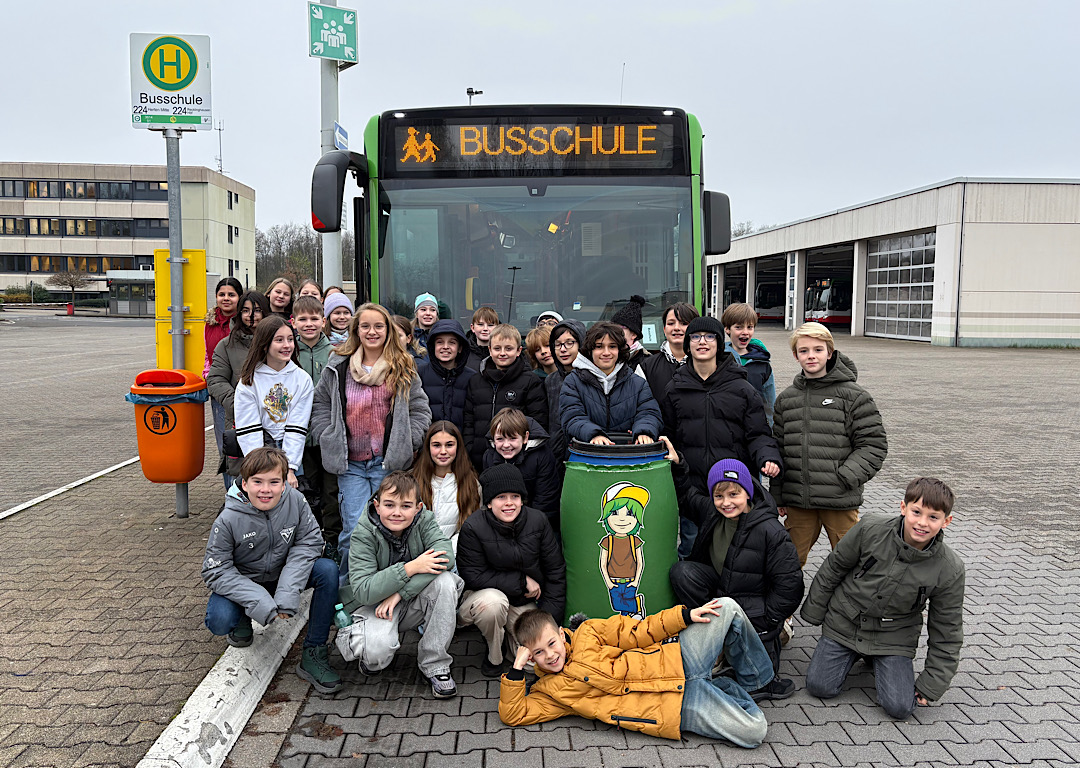 In dieser Woche haben alle Schülerinnen und Schüler unseres 5. Jahrgangs die „Busschule“ der Vestischen besucht. Das Busfahren nimmt für viele Kinder und Jugendliche einen bedeutenden Platz auf dem täglichen Weg zur Schule ein. Doch besonders Kinder sind gegenüber Erwachsenen im Straßenverkehr benachteiligt: Sie sind kleiner, unkonzentrierter, können Geräusche schlechter zuordnen und verhalten sich leider nicht immer richtig. Alle Klassen unseres 5. Jahrgangs konnten auf dem Betriebshof der Vestischen in Herten das Busfahren praktisch unter Anleitung üben. Dazu gehörten u.a. das sichere Sitzen und Stehen im Bus, das richtige Verhalten beim Ein- und Aussteigen und welche Gefahren an der Haltestelle lauern können. Zudem wurden auch die Themen Schwarzfahren und Vandalismus angesprochen. Bei der Besichtigung des Betriebshofes konnten die Fünftklässlerinnen und Fünftklässler einmal einen Bus von allen Seiten inspizieren und sogar selbst auf dem Fahrersitz Platz nehmen.