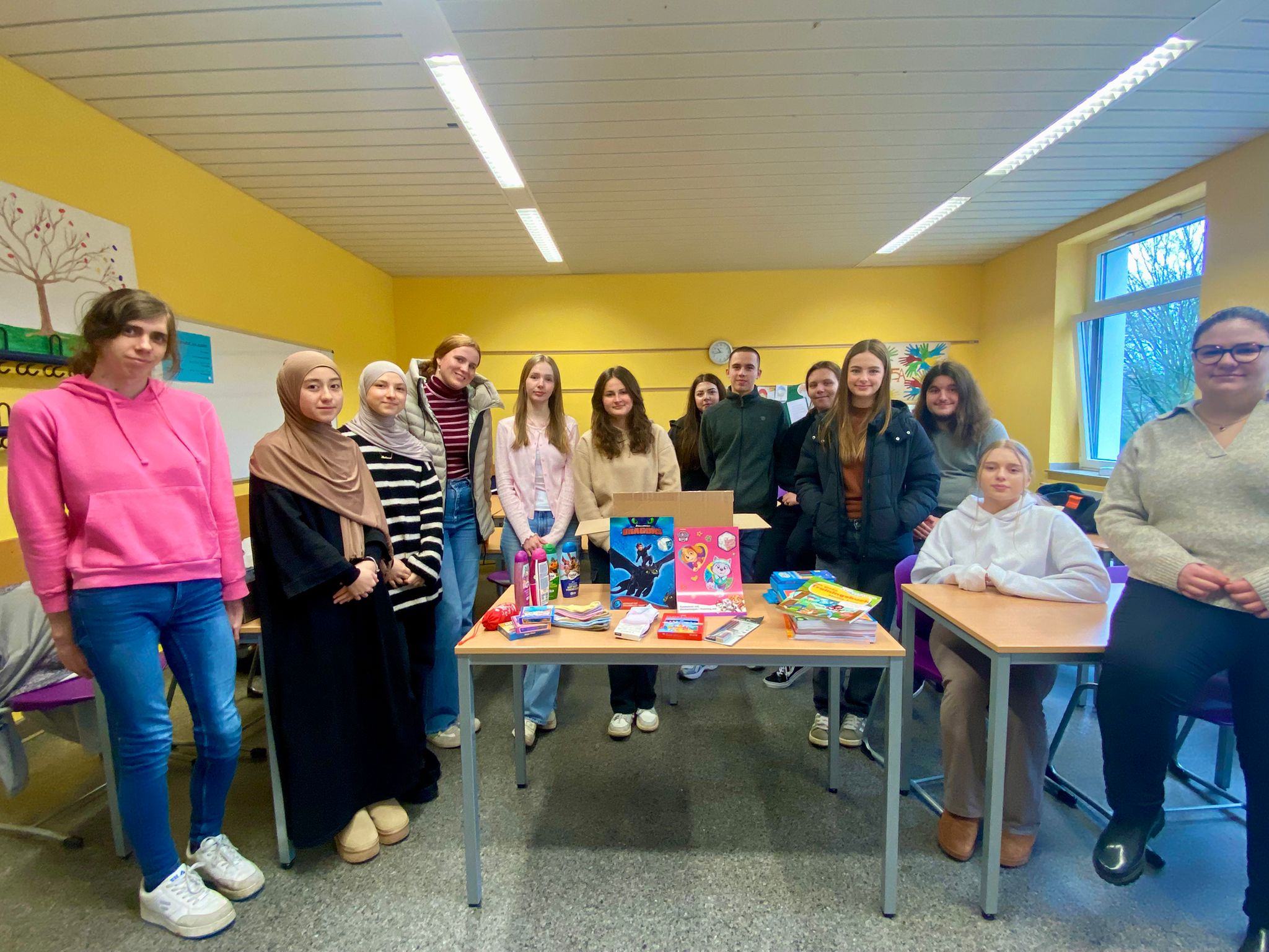 Der Pädagogikkurs der Jahrgangsstufe Q2 hat in dieser Woche ein großes Paket mit Sachspenden für das Friedensdorf Oberhausen gepackt und gestern überreicht. Es wurden u.a. Kleidung, Lern- und Bastelmaterialien, Hygieneartikel und Bücher von unseren Schülerinnen und Schülern zusammengetragen und ins Paket gelegt. Seit 1967 hilft das Friedensdorf verletzten und kranken Kindern aus Kriegs- und Krisengebieten durch medizinische Behandlung hier bei uns in Europa. Die friedenspädagogische Arbeit fördert zudem soziales Bewusstsein.