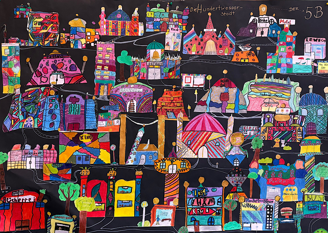 Die Klasse 5b hat im Kunstunterricht mit Frau Schwarz eine Collage mit Häusern im Stil des Malers Friedensreich Hundertwasser erstellt. Zunächst haben die Schülerinnen und Schüler besprochen, welche Häuser eigentlich in eine „richtige“ Stadt gehören und diese dann nach dem Vorbild der berühmten Hundertwasser-Häuser gestaltet. Das Ergebnis ist eine eindrucksvolle Sammlung vieler bunter und verschiedener Gebäude. Die gesamte Stadt hat alles, was man zum Leben und Wohnen braucht. Das große Plakat hängt nun im Klassenraum der 5b und kann von allen bestaunt werden.